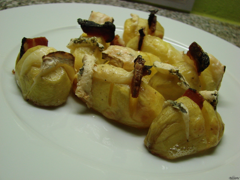 Brambory omyjeme nebo oloupeme a rozkrojíme podélně napůl. Položíme je na plech a do vrchní části vyřežeme drážky, do kterých dle chuti zasuneme plátky nivy, chedaru a slaniny. Poté lehce posolíme, pokapeme olejem a dáme péct na 30 min. na 180 °C. Mezitím si připravíme dip: