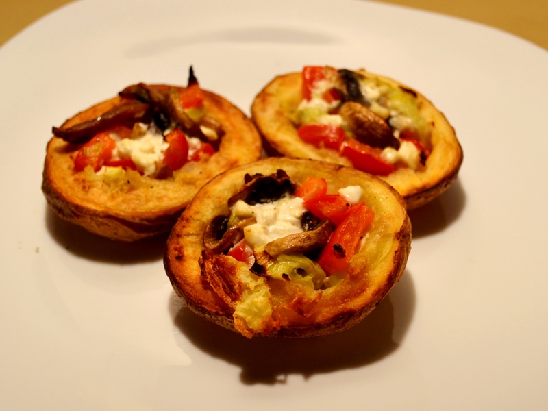 Brambory omyjeme, podélně rozkrojíme a vyskládáme na plech na pečící papír slupkou dolů. Potřeme olivovým olejem a dáme péct do předehřáté trouby na 180 °C cca na 30 minut. Mezitím si připravíme nápln - papriku nakrájíme na kostičky, houby osmažíme a lehce podusíme a obojí vmícháme do sýru cottage spolu s lisovaným česnekem a trochou soli. Když jsou brambory upečené, lžičkou je vydlabeme a naplníme směsí. Poté dáme ještě na chvíli zapéct.