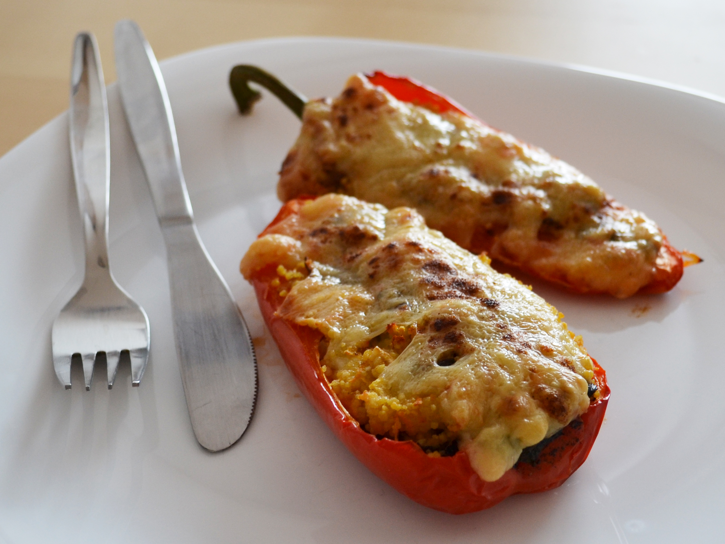 Kuskus připravíme dle návodu, papriky rozpůlíme a odstraníme jadřinec, sušené houby namočíme. Připravíme směs kuskusu, nastrouhané mrkve a hermelínu, hub, cibule nakrájené na drobno a prolisovaného česneku, lehce osolíme a opepříme a naplníme jí papriky. Na vrch dáme plátky eidamu a posypeme mletou paprikou. Pečeme v troubě při teplote 180°C dokud papriky nezměknou.